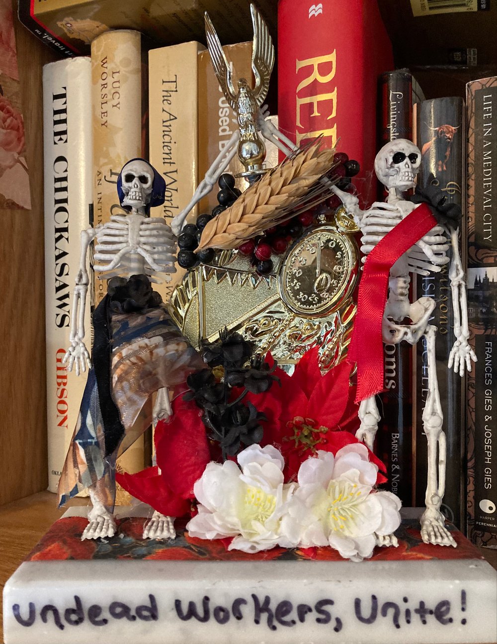 These skelies may be dead, but they’re still scaring up support for their cause. A body in every coffin and safe cemeteries for all! Rise up, zombie proletariat!